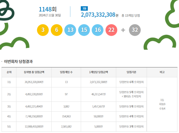 이어서 2024년 11월 30일에 진행된 제1148회 로또의 당첨 번호는 3, 6, 13, 15, 16, 22, 보너스 번호 32입니다.