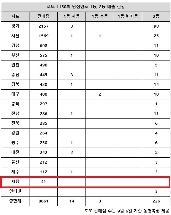 당첨 지역에 대한 정보는 다음과 같습니다. 세종 지역에서는 41개의 판매점이 있었지만, 1등이나 2등 당첨자는 없었습니다.