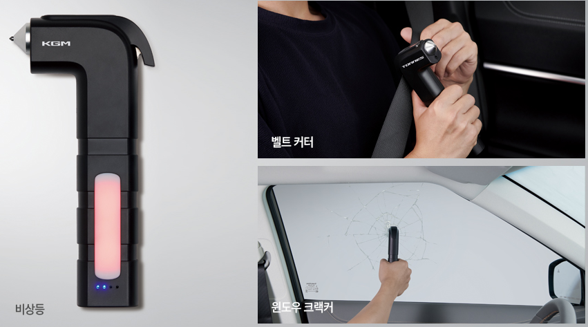 긴급 상황에서 차량에서 신속히 이탈할 수 있도록 돕는 긴급 구난장치와 사고 발생 시 비상 경광등 기능을 하나로 합친 키트를 전 트림에 기본으로 제공합니다.