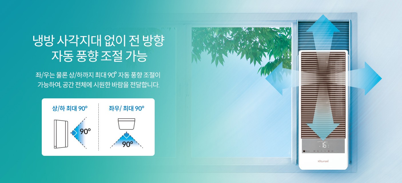 상하좌우 최대 90도 자동 풍향 조절 기능을 통해 사각지대 없이 공간 전체에 고르게 시원한 바람을 전달합니다.