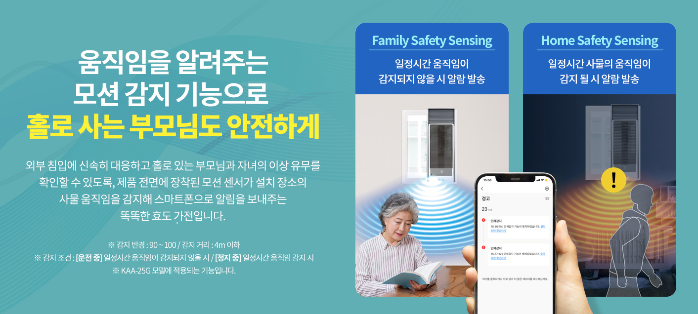 모션 센서가 장착되어 있어, 움직임을 감지하여 홀로 있는 부모님이나 자녀의 이상 유무를 확인할 수 있습니다. 이를 통해 더욱 안전한 사용이 가능합니다.