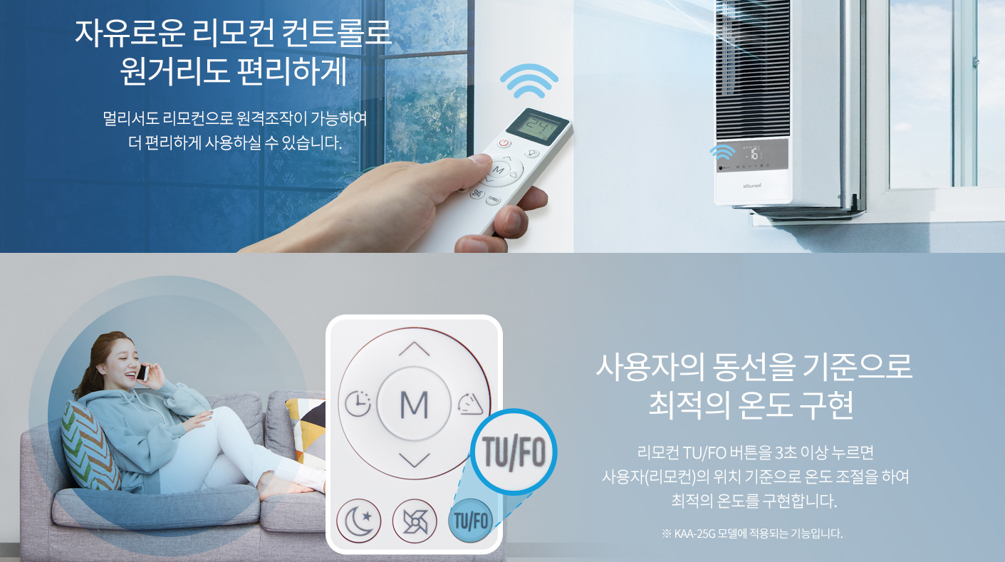 리모컨에 내장된 온도 감지 기능을 통해 사용자의 동선을 기준으로 최적의 온도를 자동으로 조절합니다.