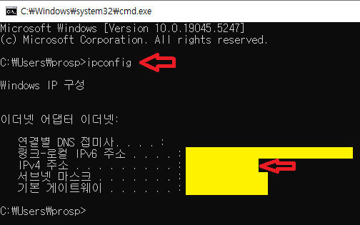 2. ipconfig 명령어 입력 : 명령 프롬프트에 "ipconfig"라고 입력하고 Enter 키를 누릅니다. 그러면 현재 네트워크 설정이 표시됩니다. 여기서 "IPv4 주소" 항목을 찾아보면 내 IP 주소를 확인할 수 있습니다.